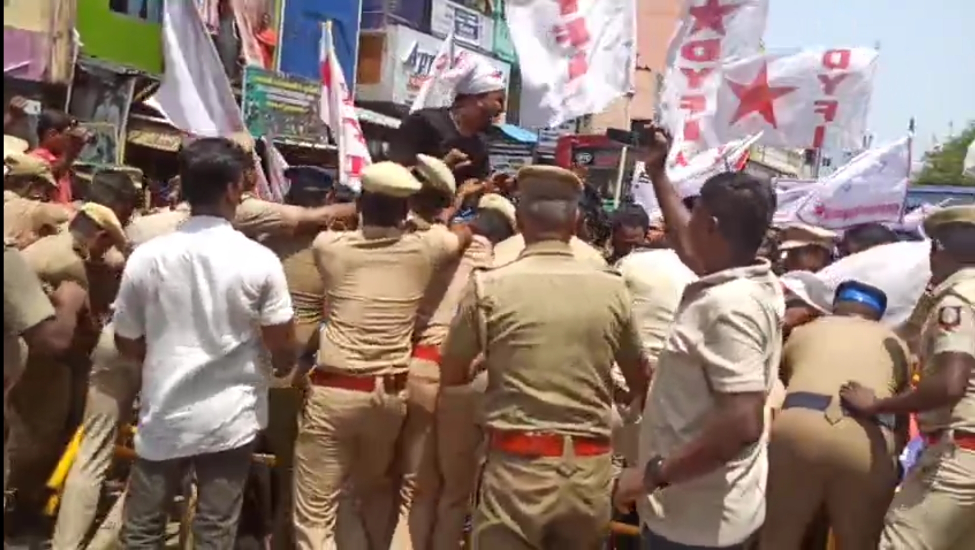 இந்த நிலையில் அங்கு கூடிய சுமார் நுற்றுக்கும் அதிகமான ஜனநாயக வாலிபர் சங்கத்தினர் ரயில் மறியலில் ஈடுபட முயன்ற நிலையில் அங்கிருந்த போலீசார் அவர்களை தடுப்புகளை போட்டு தடுத்து நிறுத்தினர். இதனால் இருதரப்பினருக்கும் இடையே தள்ளு முள்ளு ஏற்பட்டது. அதனை தொடர்ந்து ரயில் மறியலில் ஈடுபட முயன்ற பெண்கள் உட்பட 94 பேரை போலீசார் கைது செய்து அருகில் இருந்த திருமண மண்டபத்தில் தங்க வைத்தனர். இதனால் கொருக்குப்பேட்டை ரயில்வே கேட் அருகே பெரும் பரபரப்பு ஏற்பட்டது.